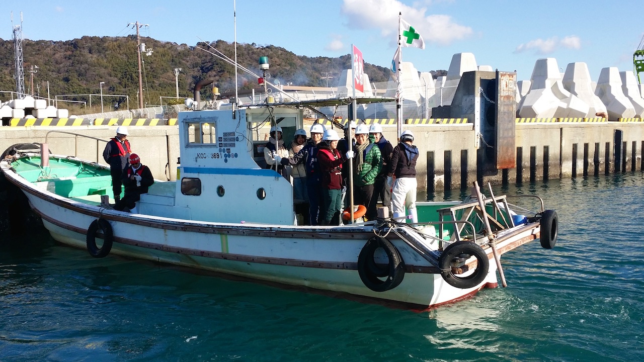 実際に船に乗り、テトラポットとケーソン据付現場へ出発です!