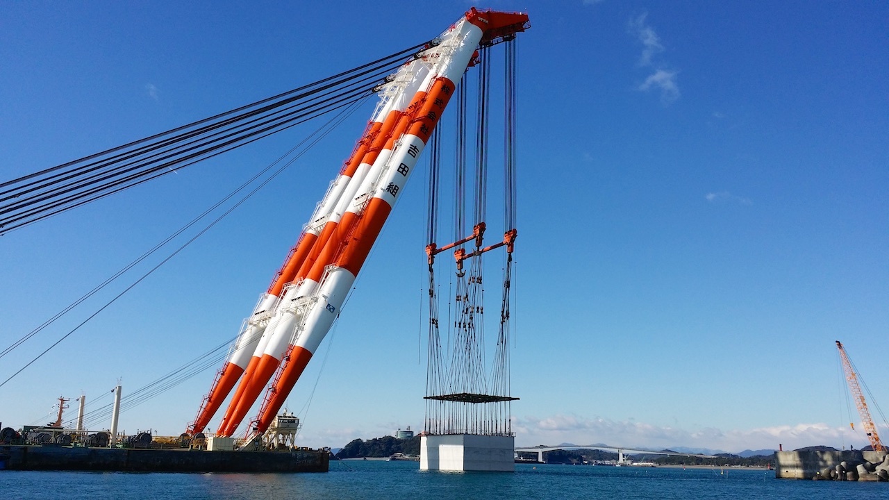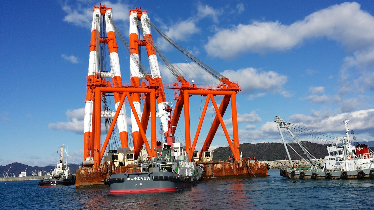 国内最大級の3700トン吊の起重機船でケーソンを曳航します。