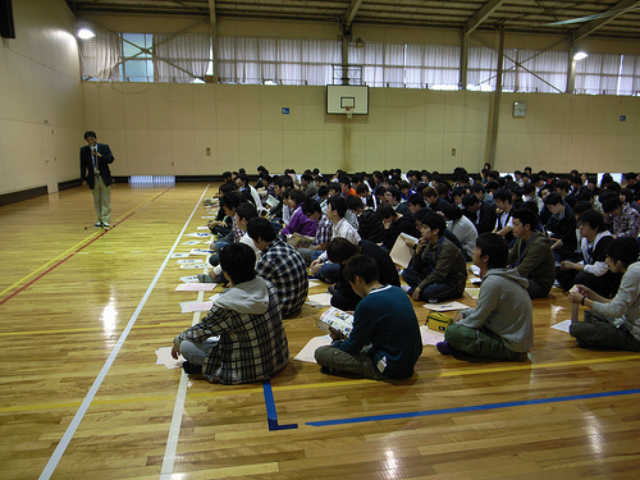 体育館でオリエンテーションの開始。先生方の挨拶、履修指導等の後、12班に分かれてミッションをこなして行きます。ミッション1は既にバスの中で様々なクイズをこなしました。