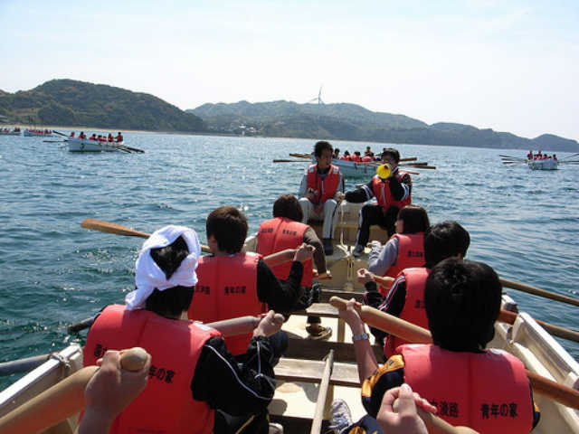 カッター訓練の様子。「一斉櫂立て!」チームワークが重要です。