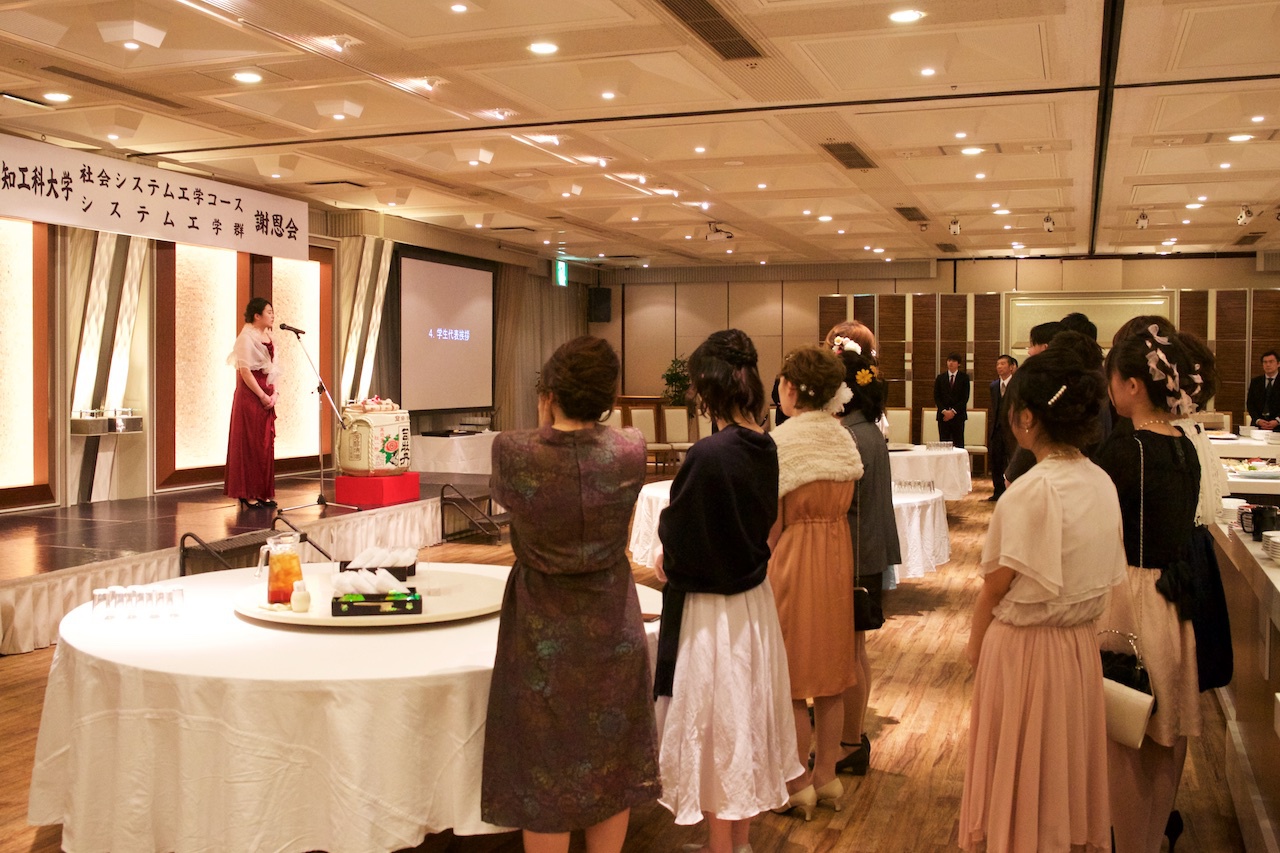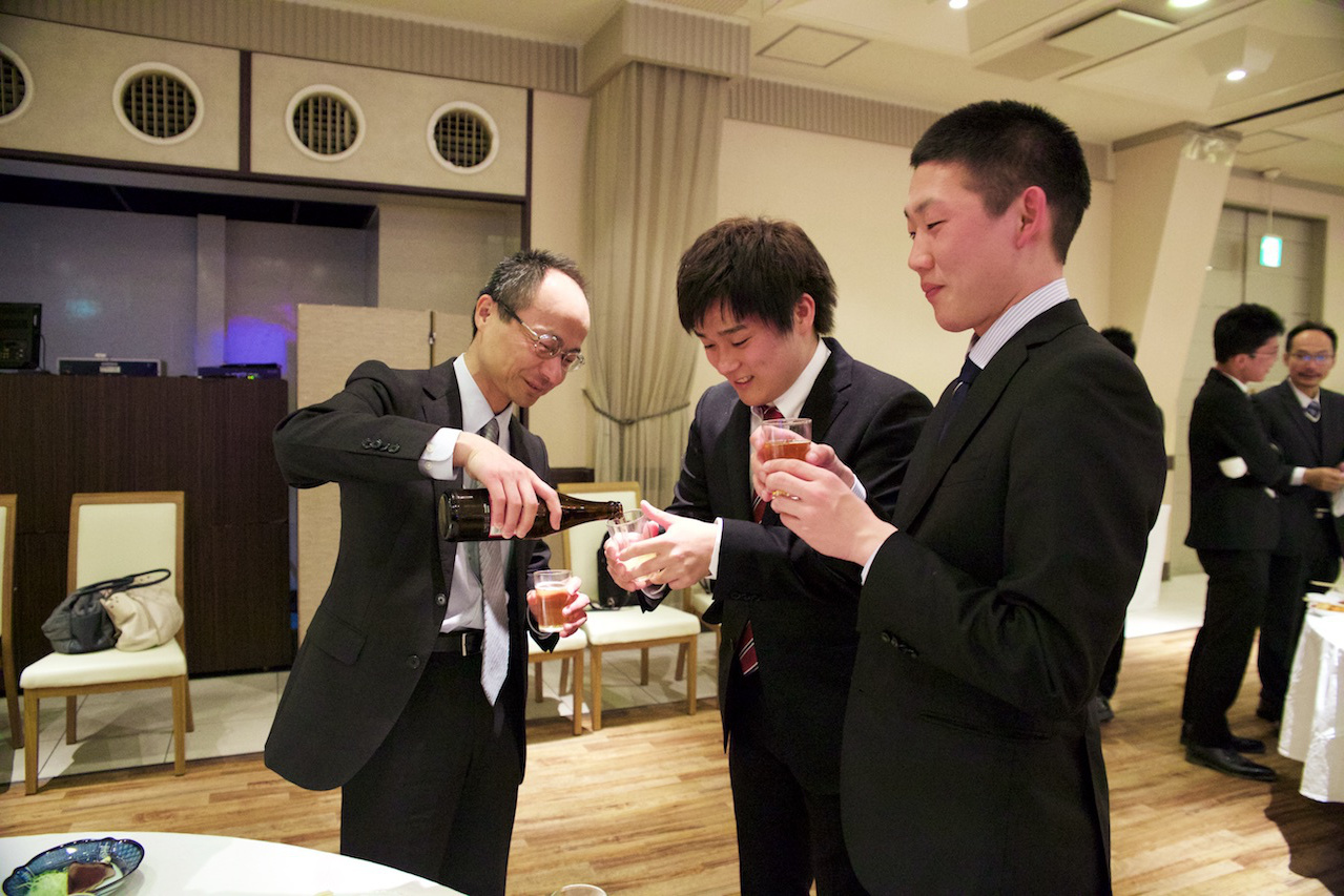 卒業生は今までお世話になった先生、秘書の方々にお酌してまわっていました。