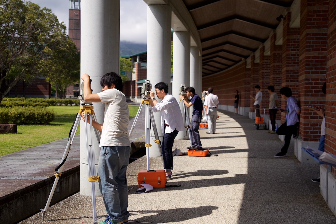 まずは試験前に測量機材に不具合がないか、各自確認します。試験中のトラブルを避ける為にしっかり取り組みます。