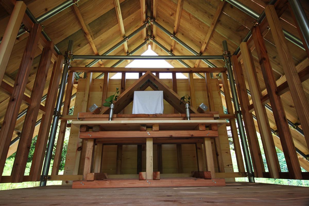神社の三角形の形状は、神聖な山をかたどるだけでなく、それにつながるトンネルを象徴しています。また構造的にもとても安定したかたちで、構造検討の結果、骨組みは地震や台風にも耐えられる強度をもっています。