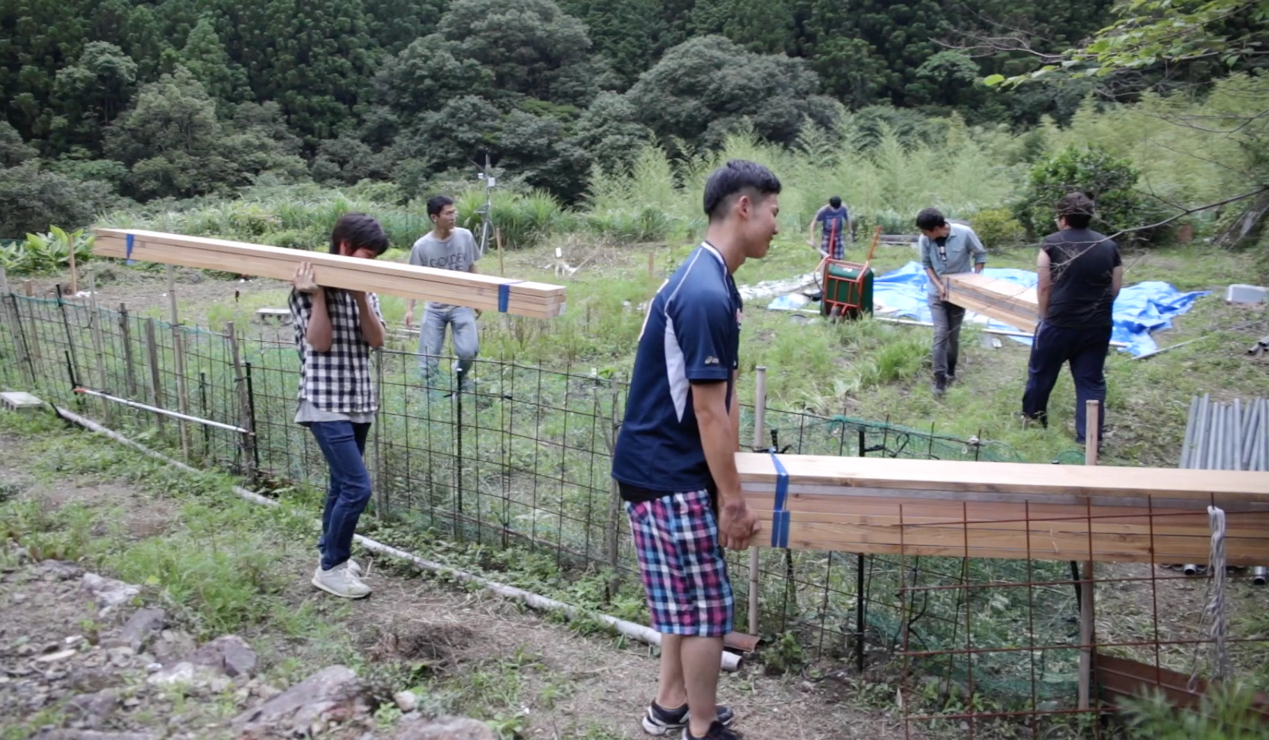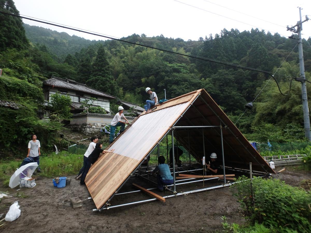 チームは渡辺准教授と、その研究室の学生メンバー10人だけで、なんと5日間で、足場用スチールパイプ、高知産の杉の垂木と厚板で仮拝殿をつくりあげました。