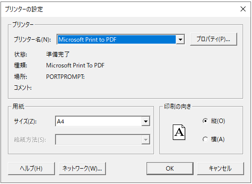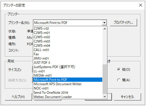 プリンタを選択するところで、Microsoft Print to PDF を選びます。