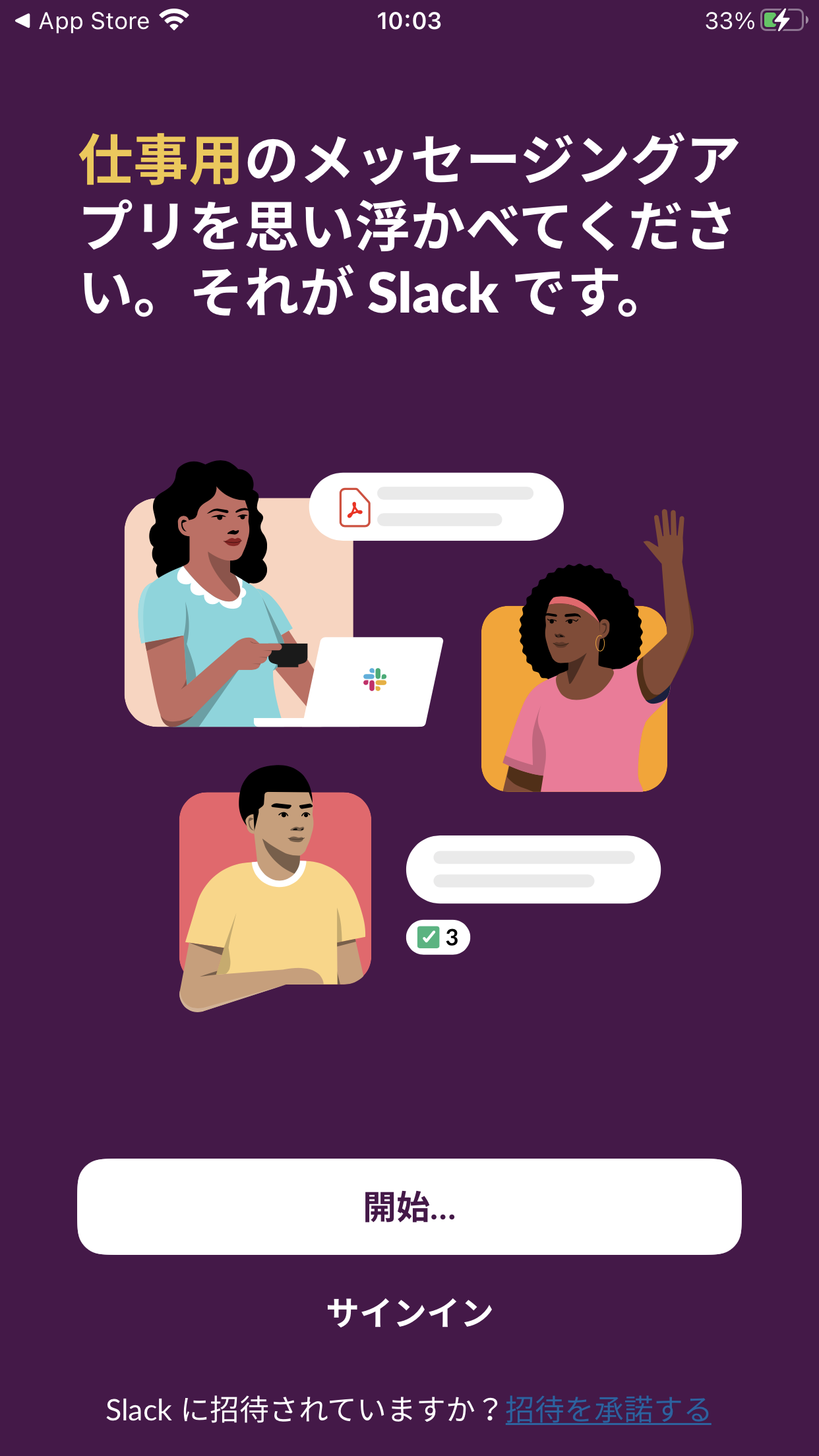 ③アプリストアで、Slackアプリを入手します。無料です。ダウンロードできたら、さっそくアプリを開きます。