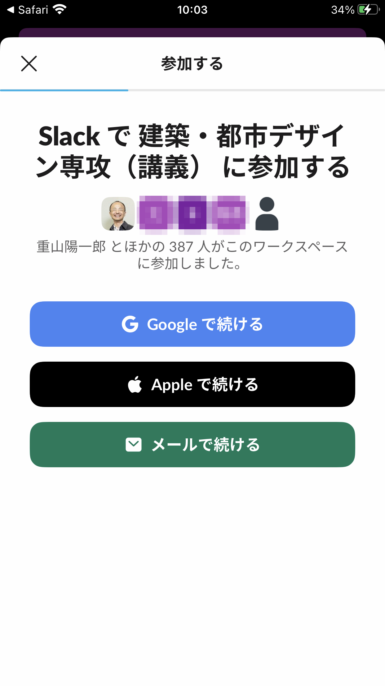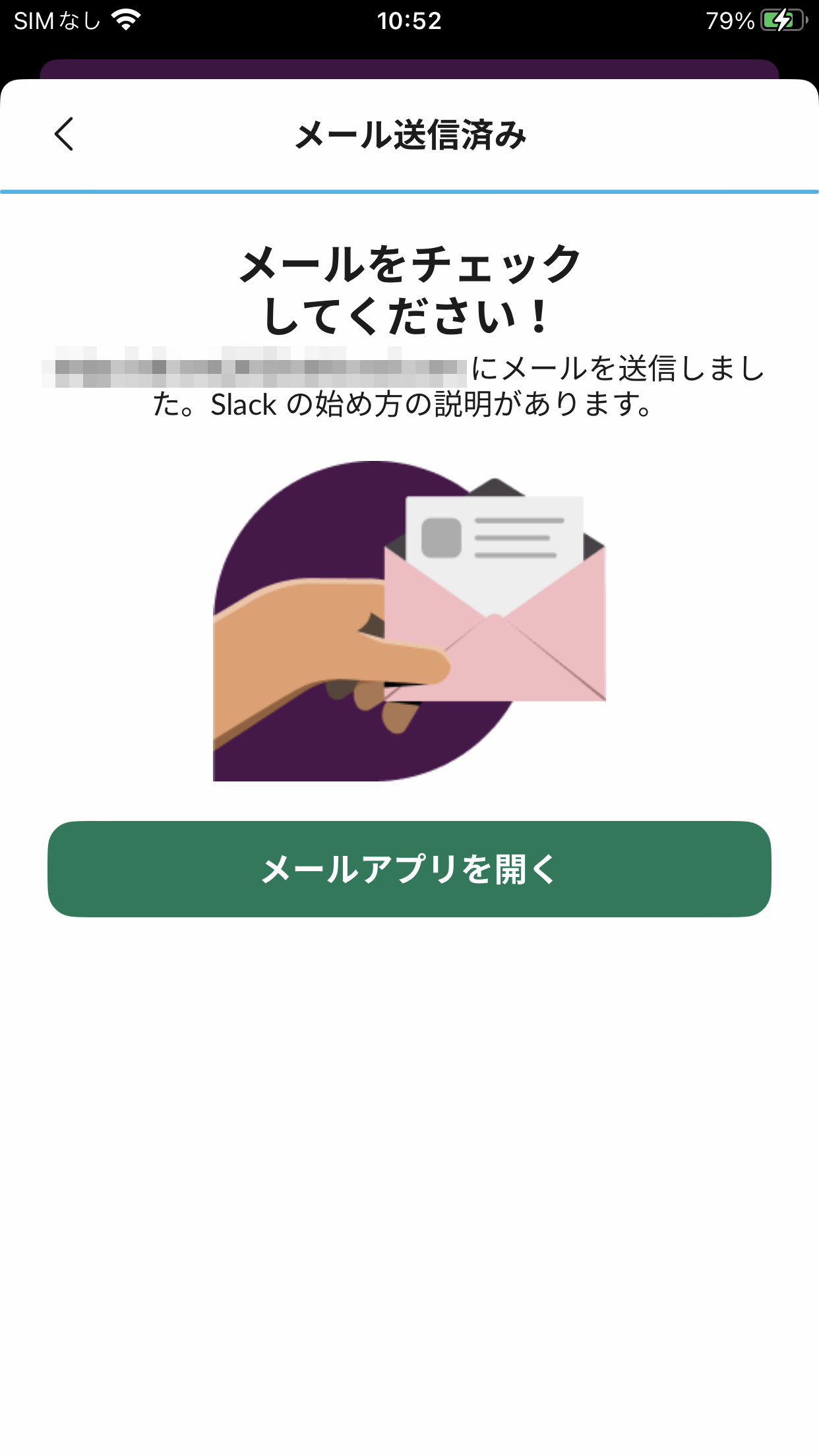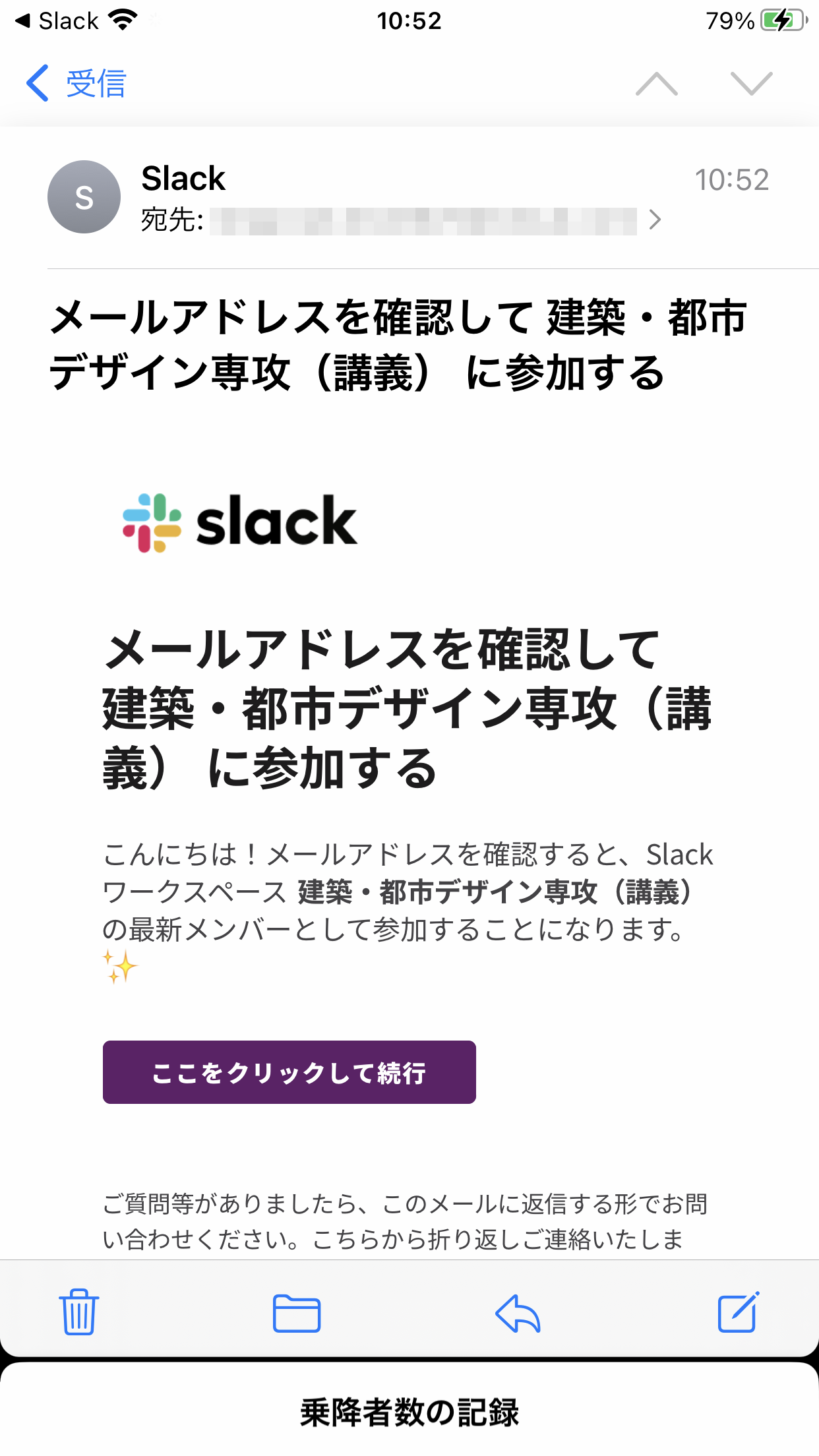 ⑧メールを確認すると、このようなメールが届いている筈です。「ここをクリックして続行」をタップすると、再びSlackアプリに戻ります。