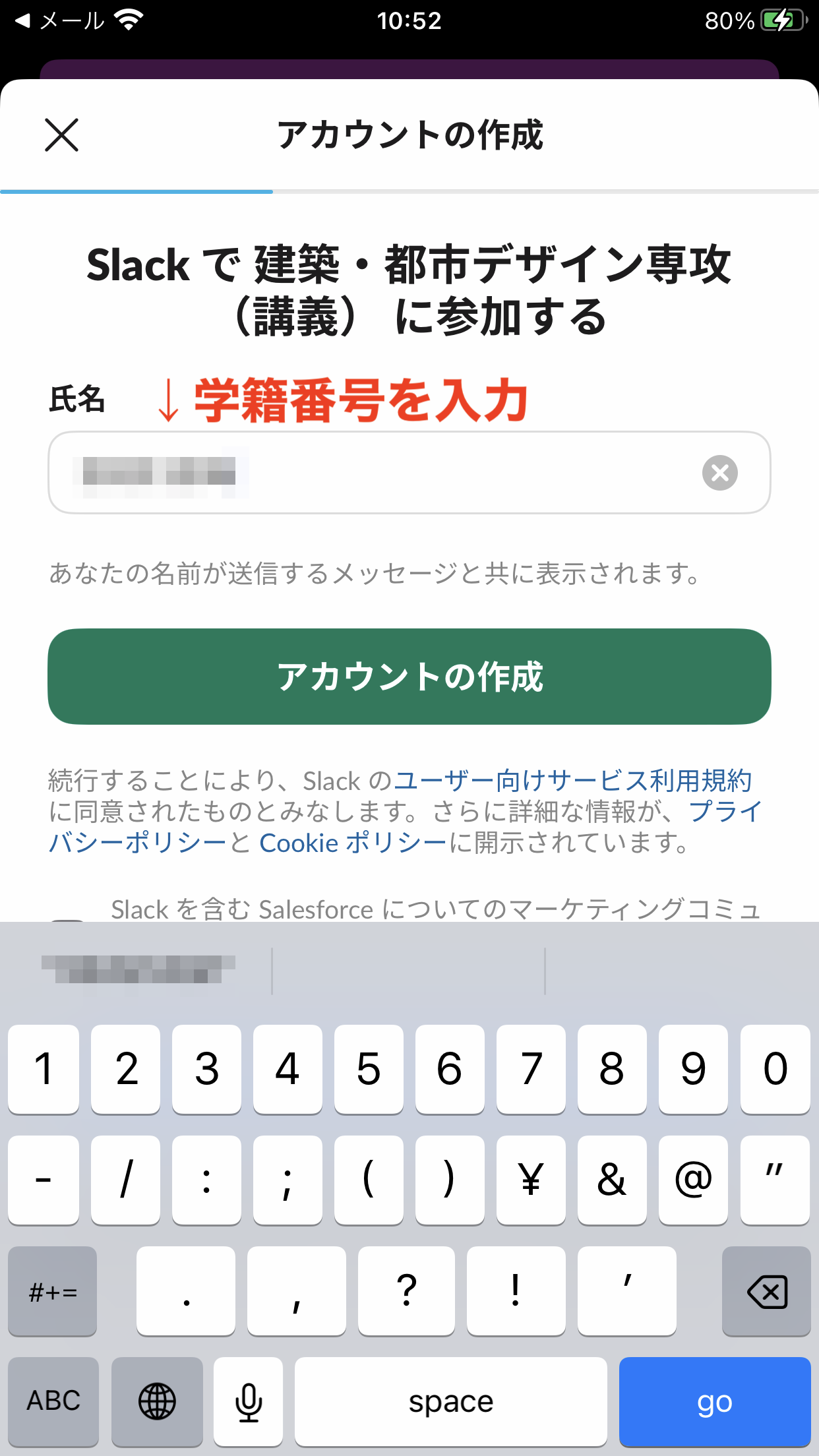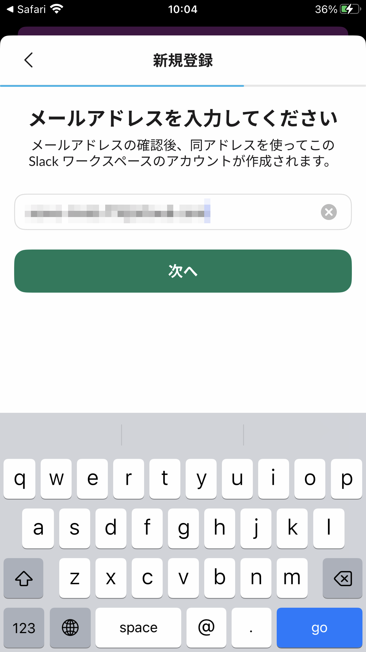 ⑥メールアドレスを入力します。メールアドレスはSlackの管理者(重山)には見えますが、他のメンバーには見えません。